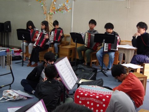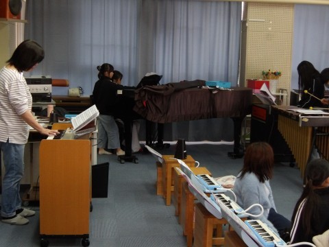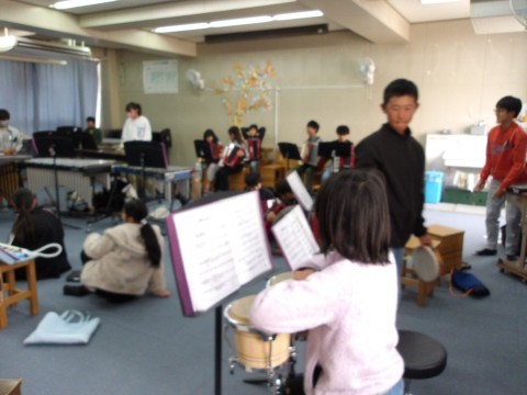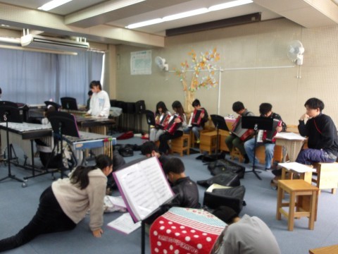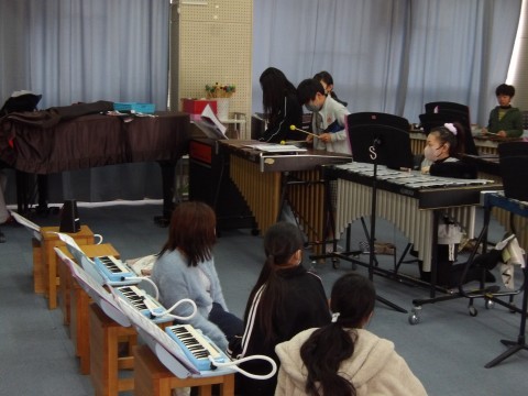 音楽では,合奏の練習をしています。このクラスは,「名探偵コナン~メインテーマ~」に挑戦しています。