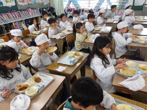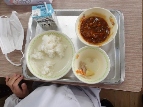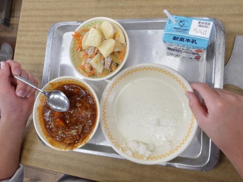 今日の献立「ハヤシライス」には,たくさんの玉ねぎが使われています。玉ねぎは,油でよく炒めると甘くなり,料理を引き立てます。今日も玉ねぎのおいしさたっぷりのハヤシライスです。