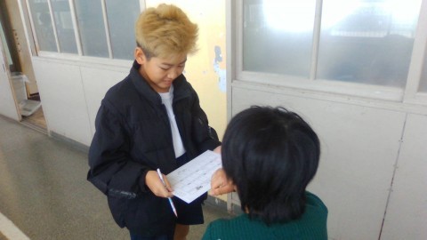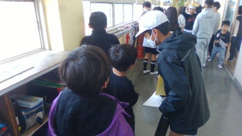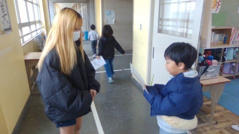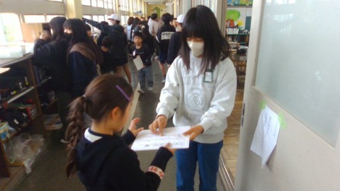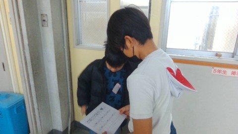 2年生が九九をとなえるのを,5年生に聞いてもらい,合格したらサインをもらいます。