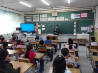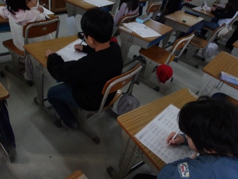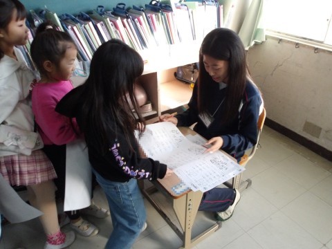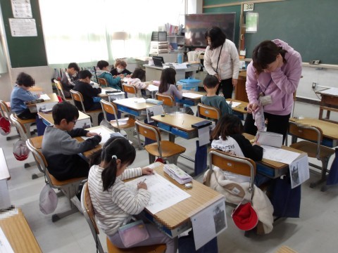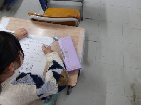 算数では,ひき算のプリント問題を解いています。できたら,職業体験に来ている中学校の生徒に,確認してもらっています。