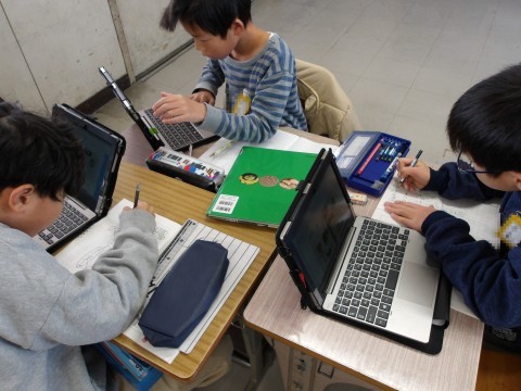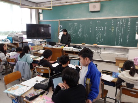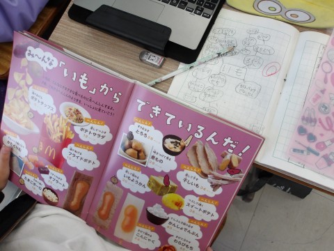 国語「食べ物のひみつを教えます」では,自分たちが調べる食べ物について,調べたことをまとめます。「はじめ・中・おわり」などの組み立てと例の書き方を考えながらまとめます。