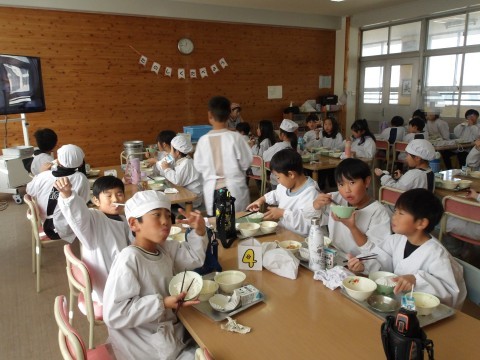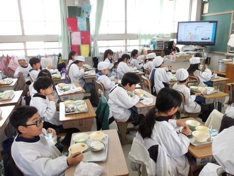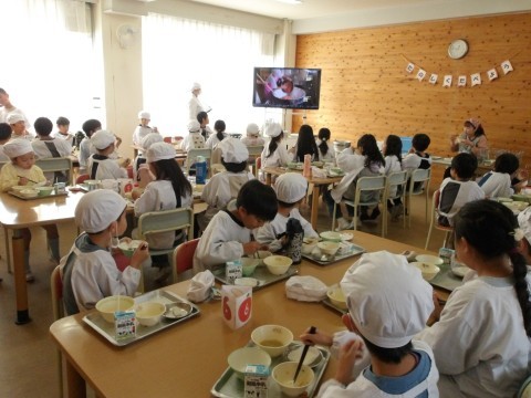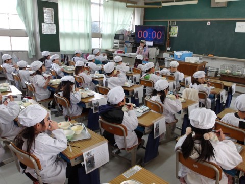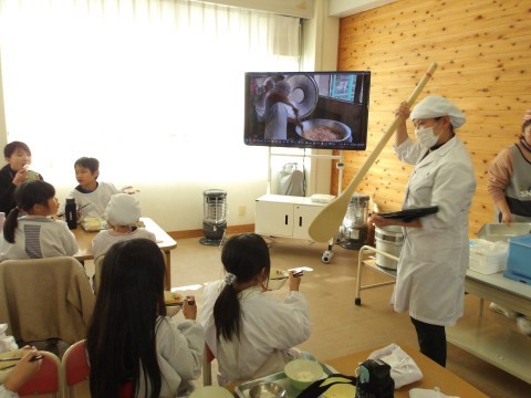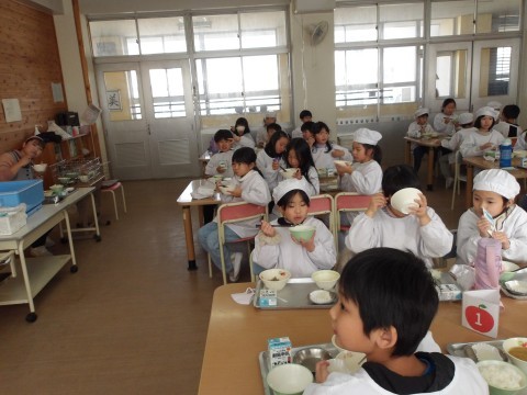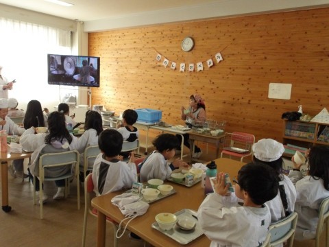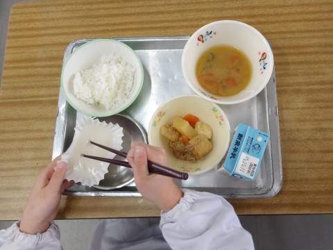 今日の献立「ういろう」は,米粉に砂糖や水を練り混ぜ蒸して作る和菓子です。給食では,オーブンで蒸し焼きにしています。もっちりとした食感を味わっていただきましょう。