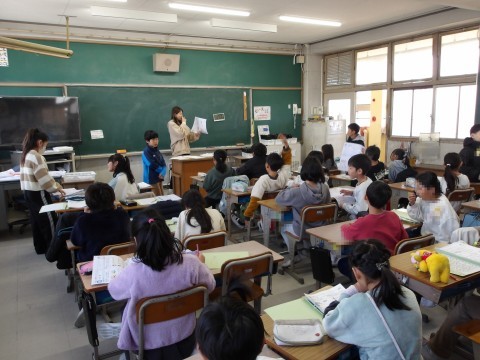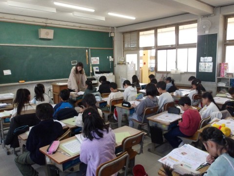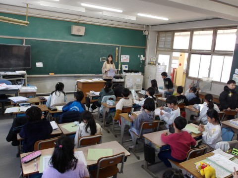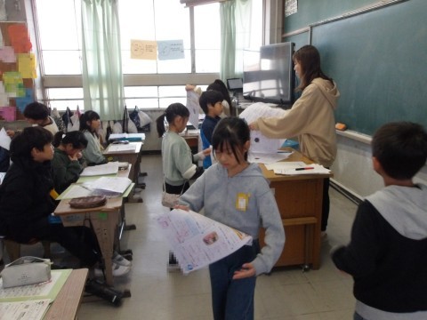 国語「わたしのまちのよいところ」と,算数「少数・円と球」のテストが返却されています。