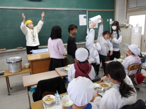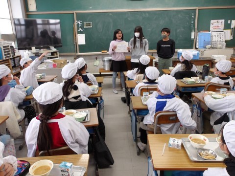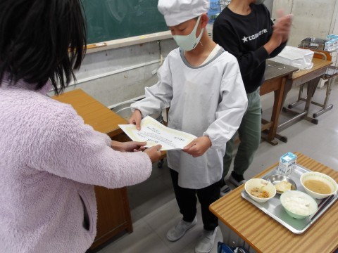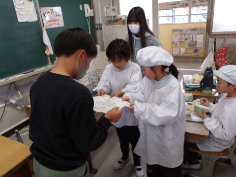 給食の時間に6年生が,総合的な学習の時間「深井向上プロジェクト」の取組結果を伝えに来てくれました。しっかりと帽子をかぶることができましたね。