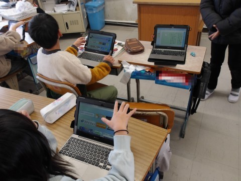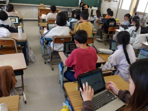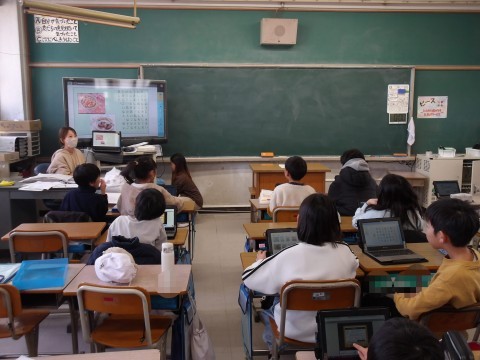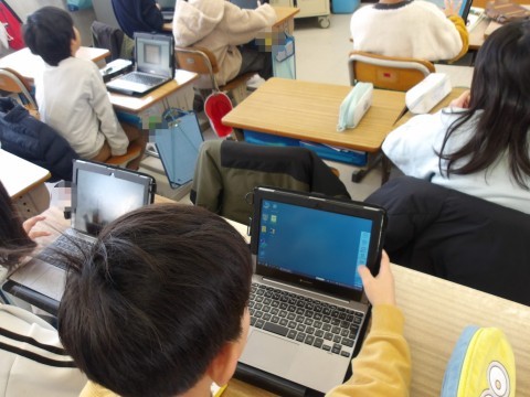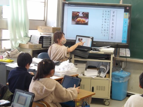 国語「食べ物のひみつを教えます」では,自分が調べたい食べ物を,文章と資料・写真などを使ってまとめました。仕上がった人はタブレットで提出しました。さっそく先生が,提出されたものをみんなに披露しています。とても工夫されていて,しっかりとまとめることができています。他の人のものも見てみたいな。
