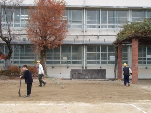 体育の授業で使う砂場を,朝早くから整備しています。みんなためにありがとう。