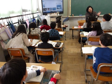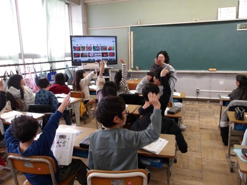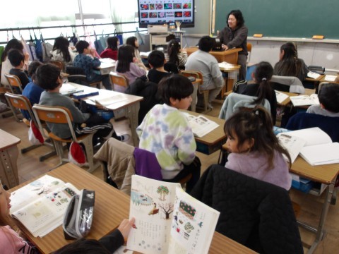 国語「冬がいっぱい」では,先生が冬を感じるものをテレビに映して解説しています。白鳥,ツバキ,かも…知っているものはあるかな?