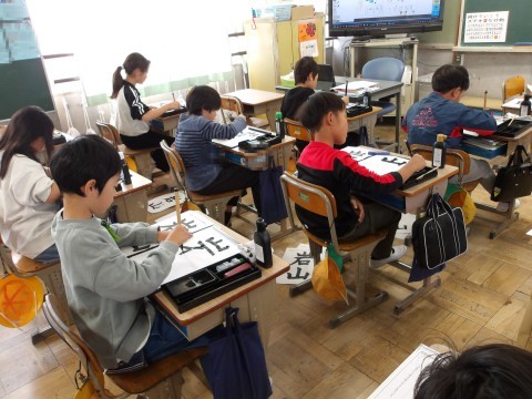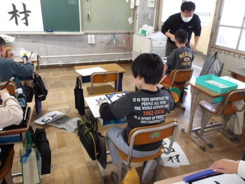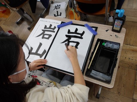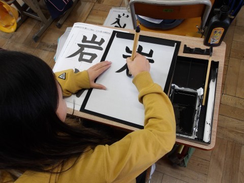 書写では,のどちらかの課題を選んで取り組みます。「岩山」は,上の部分と下の部分の組み立て方に気を付けて書きます。「木材」は,右はらいの筆圧に気を付け,「木」がキヘンになると幅は狭くなり,点画が変化することに気を付けて書きます。