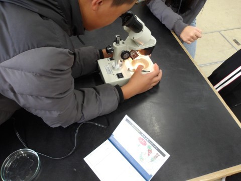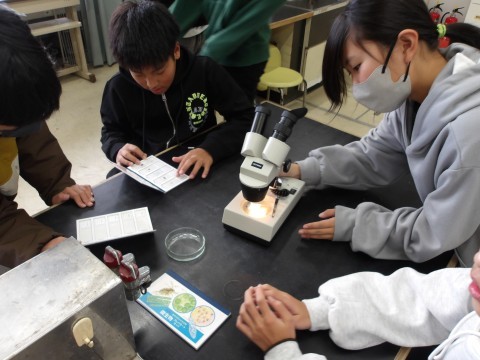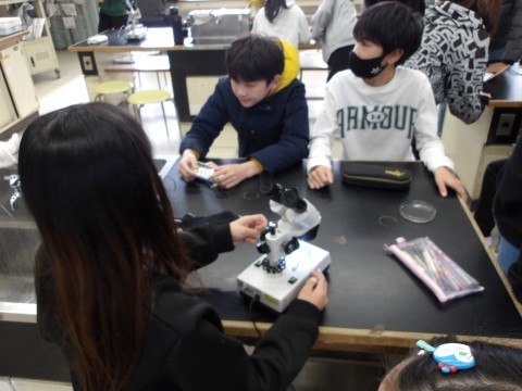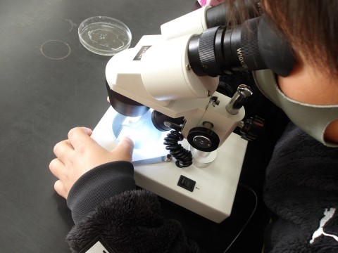 理科では,教室で育てているめだかの水質を調べエイます。どんな微生物がいたかな?
