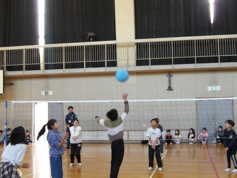 2組の4年生と6年生のバレーボールの試合が行われています。4年生は,授業で取り組んだ成果を発揮しています。