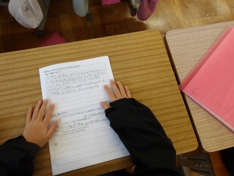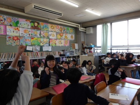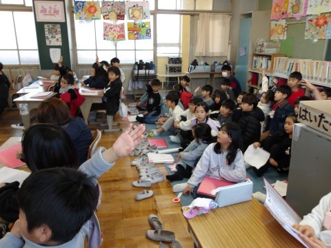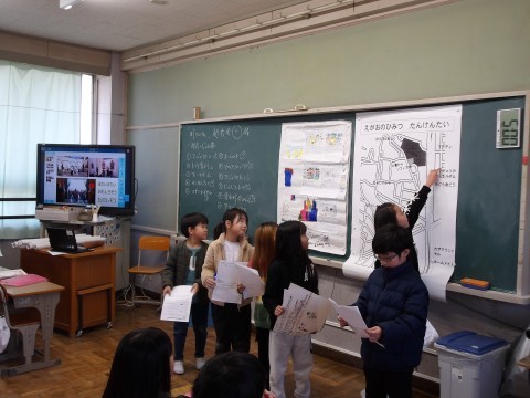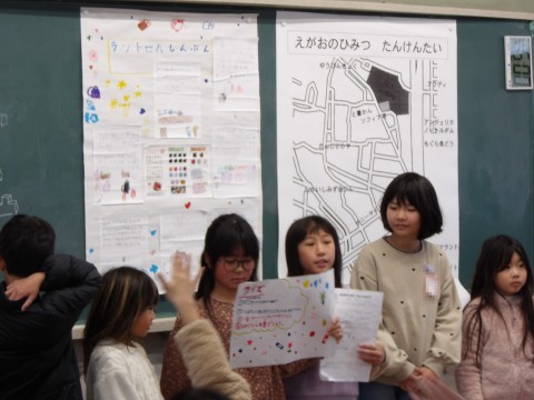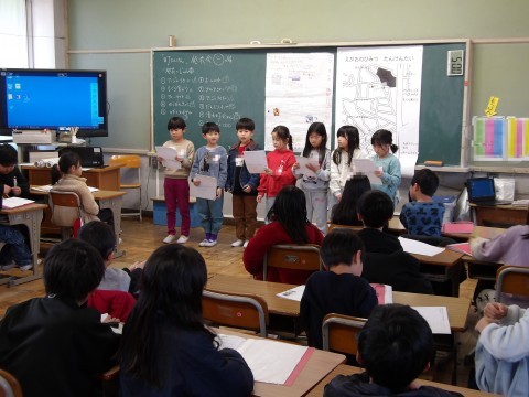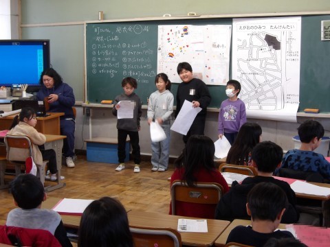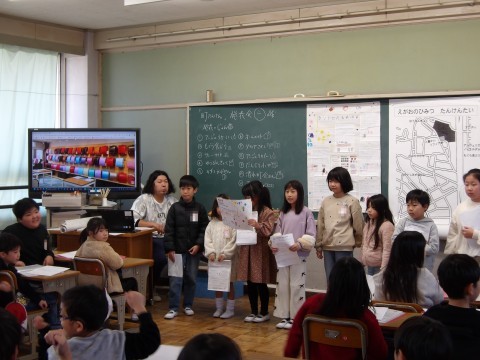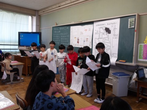 総合的な学習の時間で取り組んだ「えがおのひみつたんけんたい」で,体験したことや調べてきたことを発表しています。感想を伝えたり,クイズにしたりして,探検した場所について詳しく話しています。