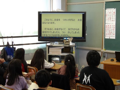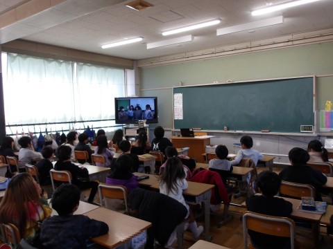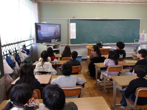 児童会が作った「冬休みの過ごし方」のビデをを見ています。