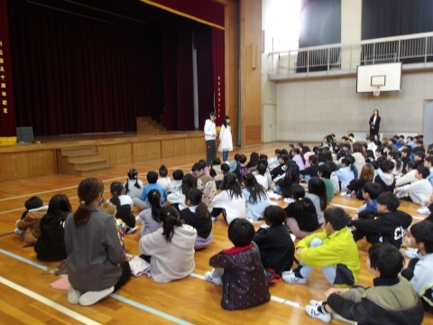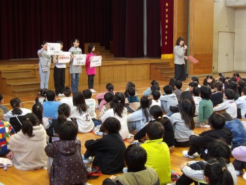 読書感想画,6年生タイピングチャンピオン決定戦の表彰が行われました。生徒指導担当からは,「お金」「もの」「安全」について話があり,トラブルに巻き込まれないこと,公共のものや場所ではルールを守ること,交通安全を守ることなどの話がありました。