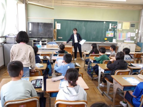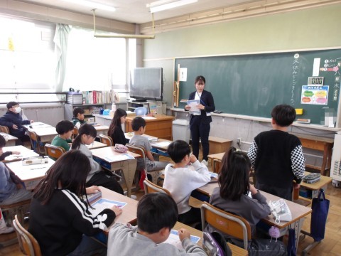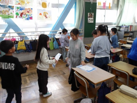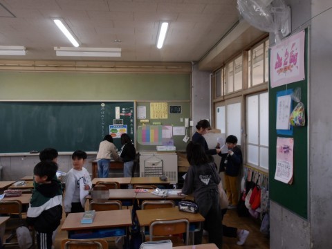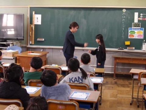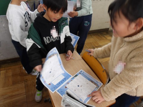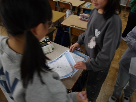 冬休みの過ごし方をビンゴで共有します。先生が説明しています。わからない所は質問をしています。