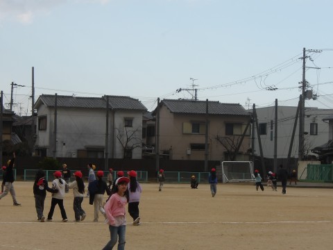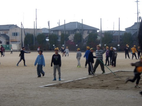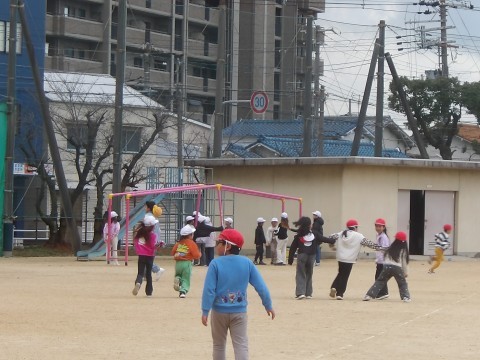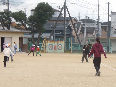 少し雪が混じる天気ですが,運動場でしっかりと体を動かしています。