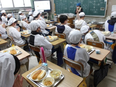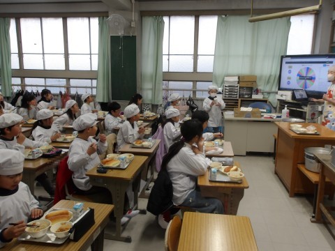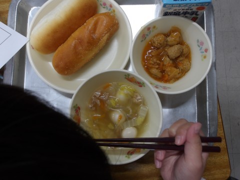 3学期の給食が始まりました。今日の献立「はるさめとうずらの卵のスープ」には,ビタミンCが多く含まれる白菜がたっぷり入っています。風邪予防や疲れをとる働きがあります。