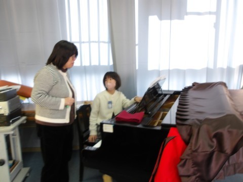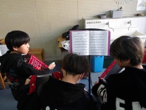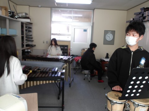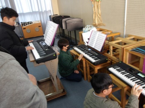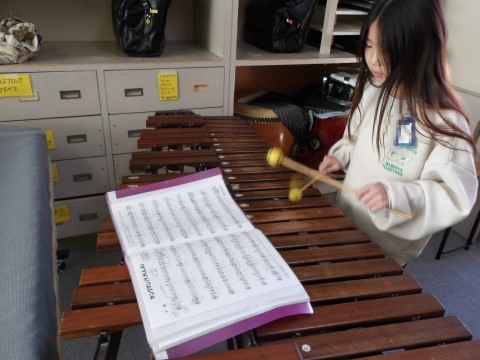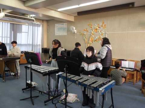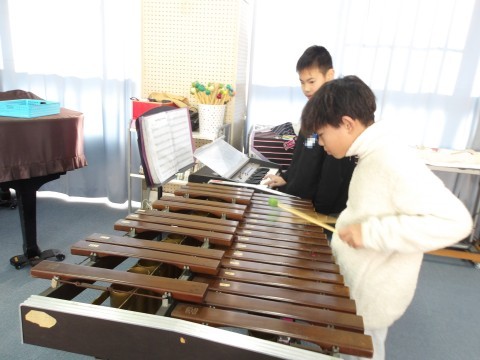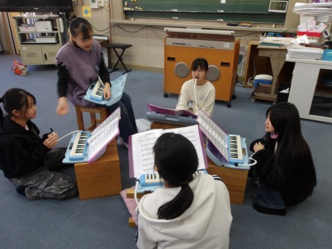 音楽では,クラス合奏「ヤングマン」の練習をしています。各パートに分かれて練習を進めています。