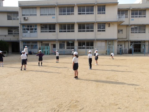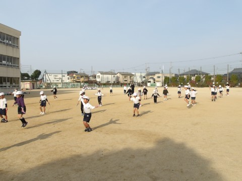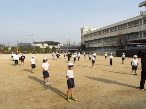 体育では,なわとび運動をに取り組んでいます。手首を上手に動かしてなわとびを回す練習をしてから,いろいろななわとびの技に挑戦します。