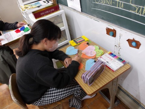 先生と一緒に集中して学習を進めています。カレンダーづくりの続きをしている人もいます。