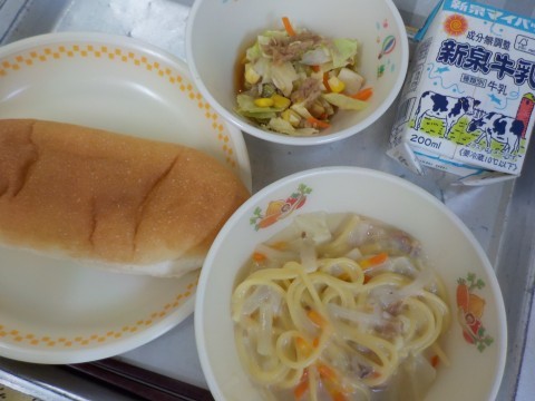 今日の献立は『ミニコッペパン・牛乳・クリームスパゲティ・ホットサラダ・レモンドレッシング』でした。