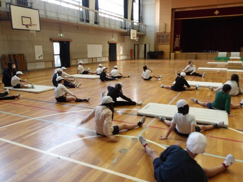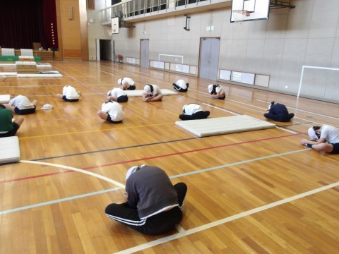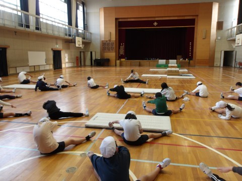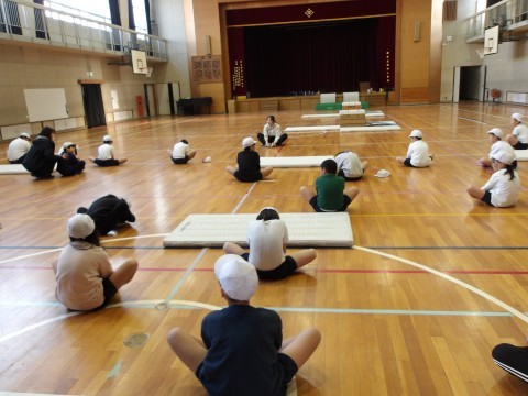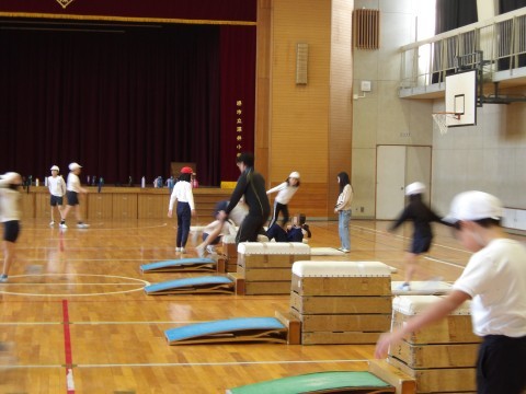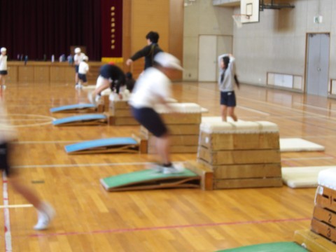 体育館の体育では,マット運動に取り組んでいます。台上前転の技を練習しています。