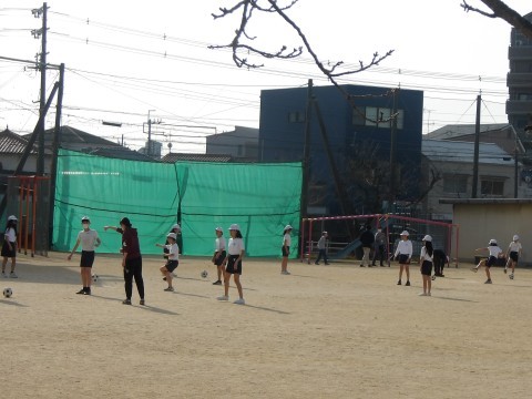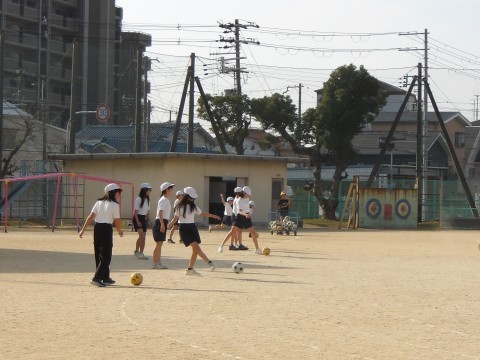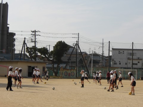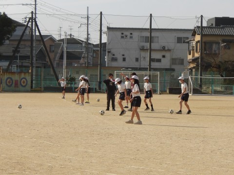 運動場の体育では,球技のサッカーに取り組んでいます。