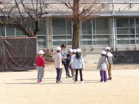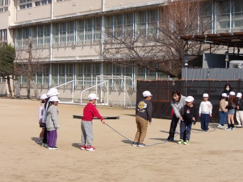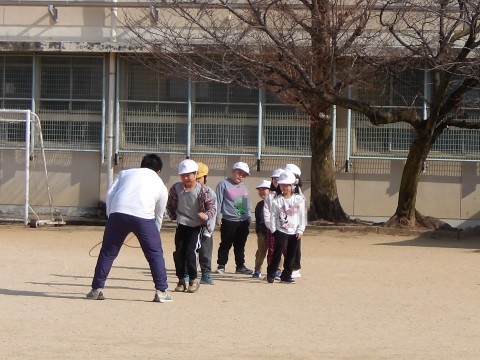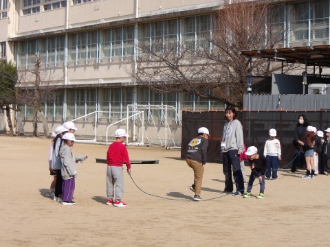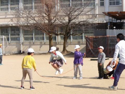 音楽では,わらべ歌に合わせて体を動かします。みんな楽しく歌いながらリズムよく縄を跳んでいます。