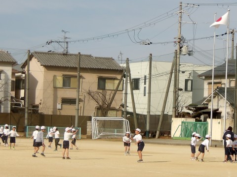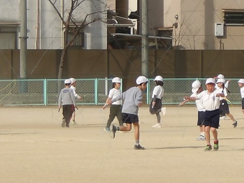 運動場では,なわとび運動が行われています。リズムよく跳べるようになってきました。