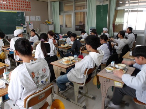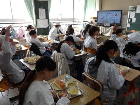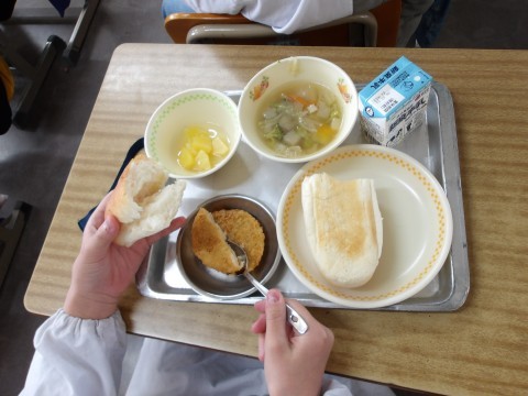今日の献立「コロッケ」を,そのまま食べたり,パンにはさんで食べたりと,おいしくいただいています。
