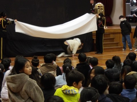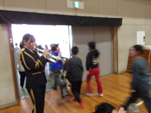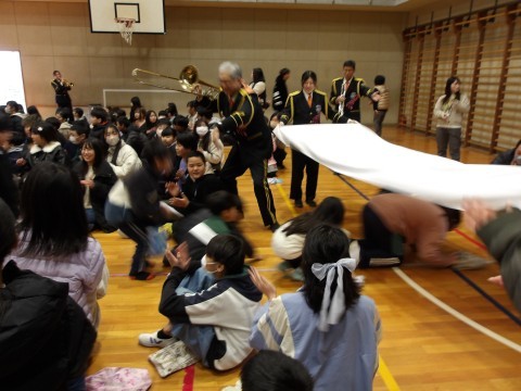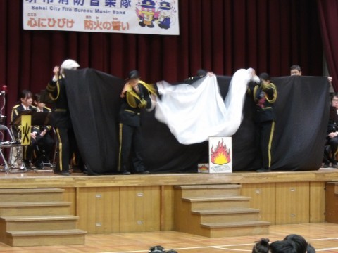 トランペットソロによる「深井小学校 校歌」の演奏に,子どもたちは驚き,「名探偵コナン」の曲で演奏が始まりました。途中に,家事を見つけたときにしてほしいことの話がありました。「火事だ~!」と大きな声で周りの大人に知らせること。煙の話では,煙から逃げる自信のある人が子どもたちの中から選ばれ,布を煙に見立てて,低い姿勢で非難する方法を実際に体験しました。また,音楽隊のみなさんと楽器を演奏したり,指揮をさせてもらったりしました。