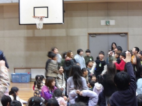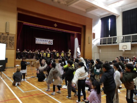 「勇気100%」「Mrs.GREENAPPLEメドレー」「ジャンボリミッキー」などの演奏を鑑賞し,アンコールに答えて「ドラえもん」を演奏くださいました。先生も子どもたちも音楽隊のみなさんも一緒に歌ったり,踊ったりして楽しい時間を過ごしました。おわりには,演奏して見送ってくださる中,子どもたちは煙からの非難を体験しながら体育館を後にしました。堺市消防音楽隊のみなさん,今日は本当にありがとうございました!
