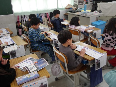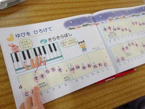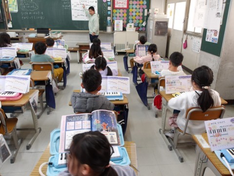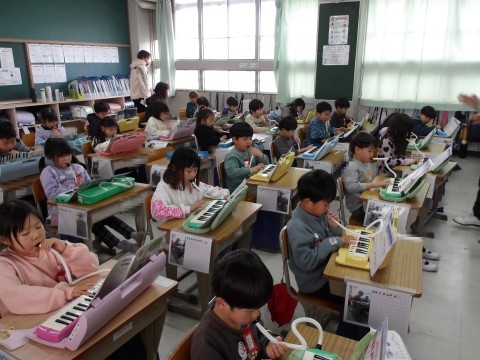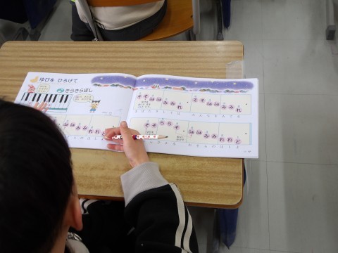 音楽では,「ふるさと」を,目をつむって育った場所や様子を思い浮かべながら鑑賞します。鍵盤ハーモニカの学習では,「きらきらぼし」を,指をひろげて弾く練習をします。指の番号と音階をしっかりと合わせて弾いています。