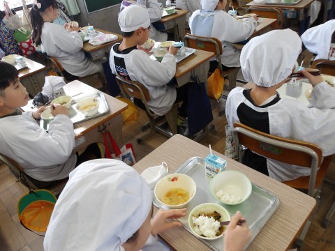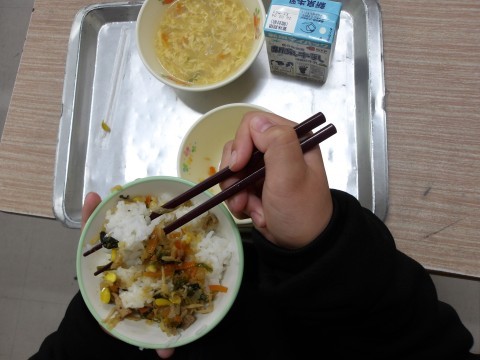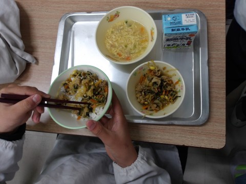 今日の献立は,「ビビンバふう」です。ごはんに混ぜていただきましょう。
