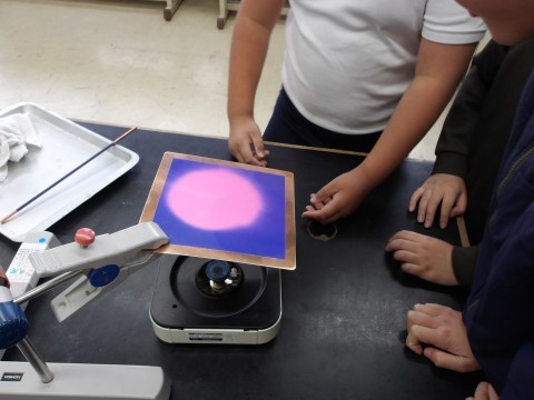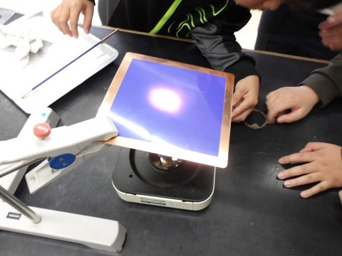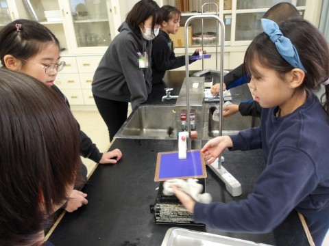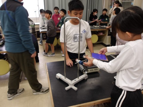 理科では,金属はどのユニあたたまっていくかについて,示温シールを貼った金属のぼうや板を使って,ガスバーナーであたためる方法で実験して確かめます。