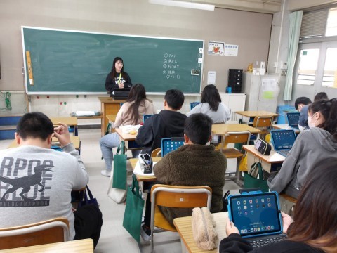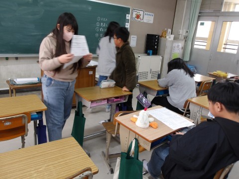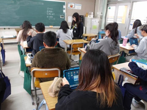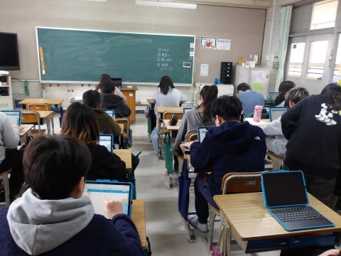 算数の宿題が返却され,やり直しや,まる付けをしていない人はきちんと答え合わせをして再提出です。先生が,「中学校では,指示されたとおりに提出しないと点数に反映されますよ。」と,丁寧にすることの大切さを話します。そのあとは,新しくなったタブレット端末を使って,アプリの場所などを確認しています。