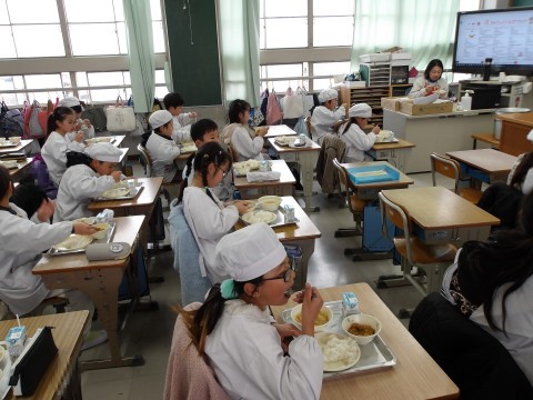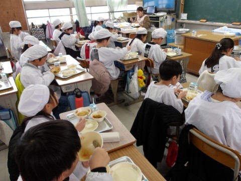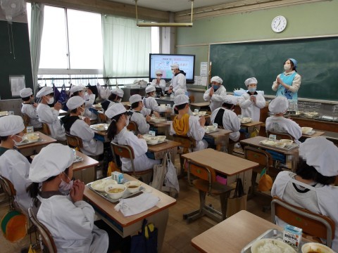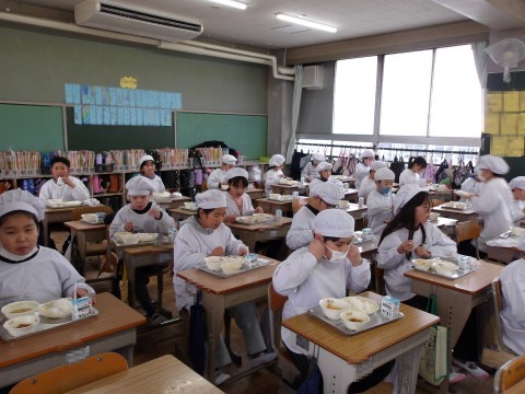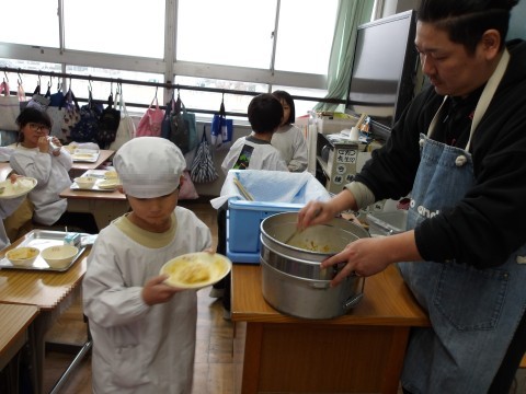 今日の献立「たまごスープ」の卵は,タンパク質・ビタミン・ミネラルが豊富で,体の成長に必要な栄養素がバランスよく入っています。今日は,スープでいただきます。たくさんの人がお代わりをして,ほとんどのクラスが完食です。