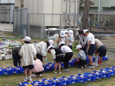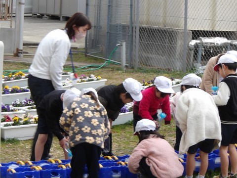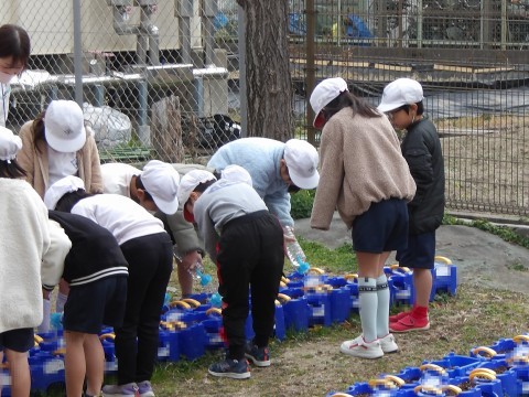 生活科で育てているチューリップの水やりをしています。少し芽が出てきだしました。