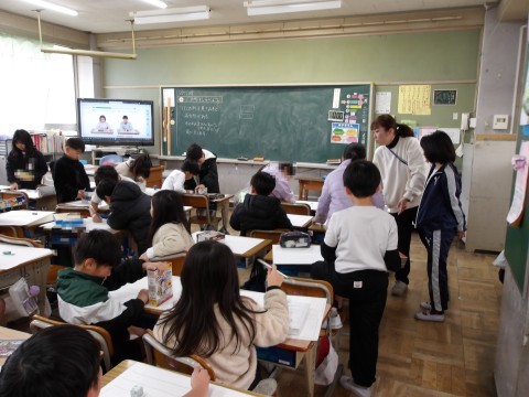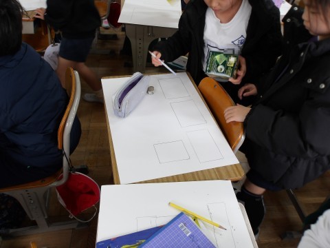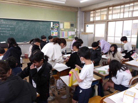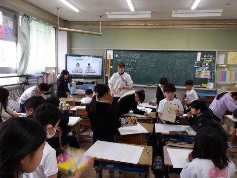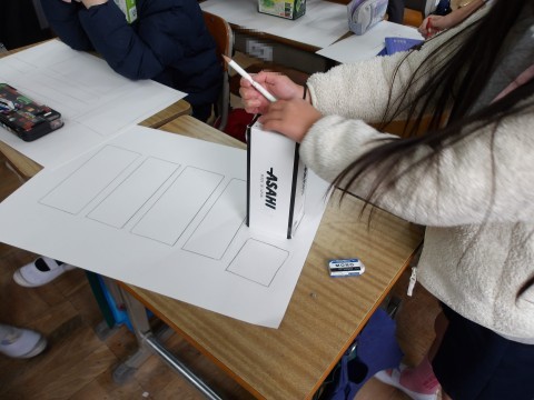 算数では,お家から持ってきた様々な形の箱の平らなところの形を紙に写し取って,箱の形を調べます。上手に写し取ることができたかな?友だちに手伝ってもらおう。