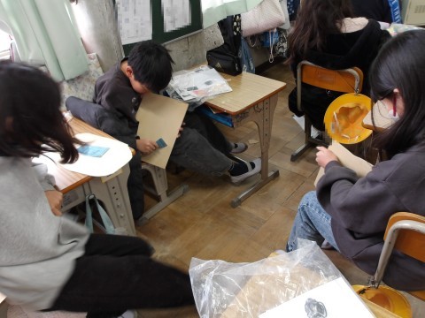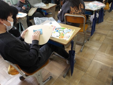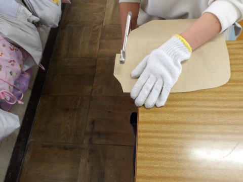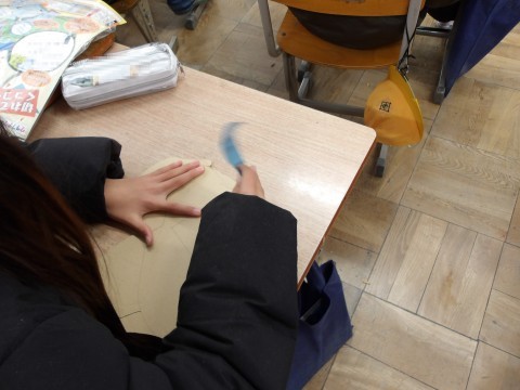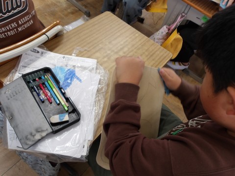 図工では,「ホワイトボード伝言板」を作成します。糸のこを使って形をつくり,やすりをかけています。