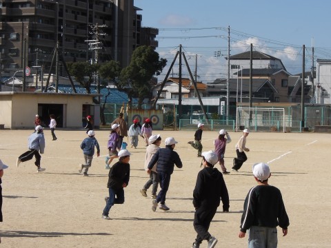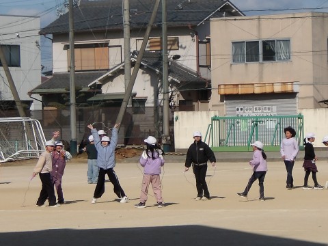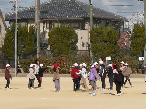 体験入学に来たお友だちと一緒に,大なわとびをしたり,鬼ごっこをしたりして,学年遊びをして楽しんでいます。