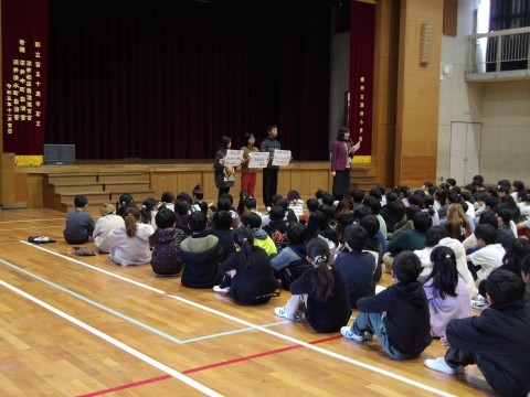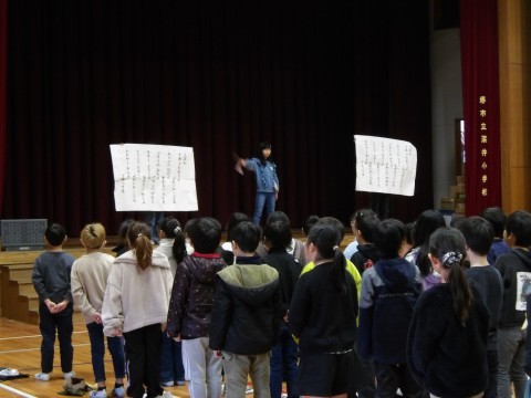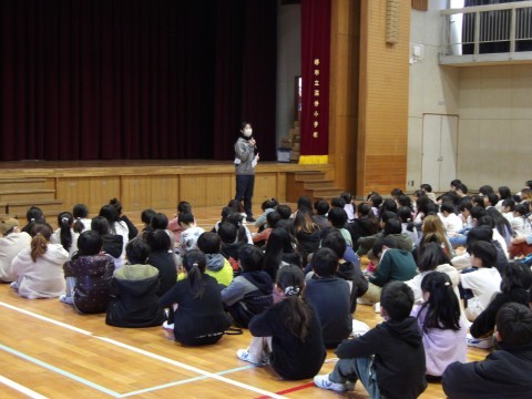 校長先生からは,2月6日から始まる冬季オリンピック・ミラノ・コルティナ大会について,「これまで取ったメダルの数の記録を向くのではないかと期待されている今回の大会,選手たちは,“ともに,一歩踏み出す勇気”という言葉を胸に,17日間を戦い抜きます。選手だけではなく“努力する喜び”を,分かち合うすべての人たちがチームジャパンになることをめざしています。ぜひ,みんなも応援しましょう。そして,みなさんも何か一つでもよいので,がんばることを決めて,“努力する喜び”を体験してほしいと思います。」と,話がありました。