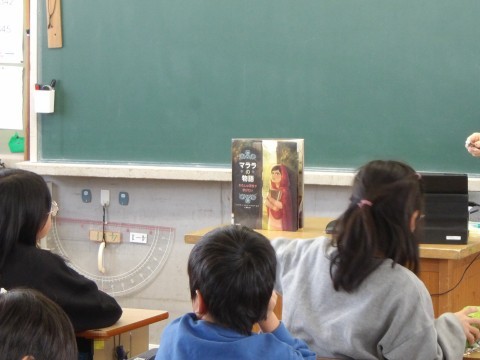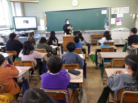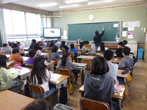 国語「風船でうちゅう」の学習に入りました。導入では,先生が本を紹介し,この本のポップづくりについて説明をしています。
