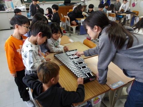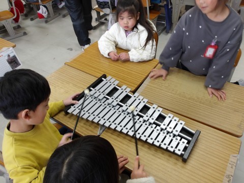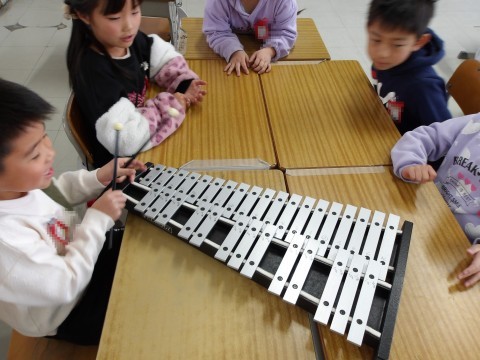 音楽では,鉄琴を使って「きらきらぼし」を演奏します。上手に演奏できています。