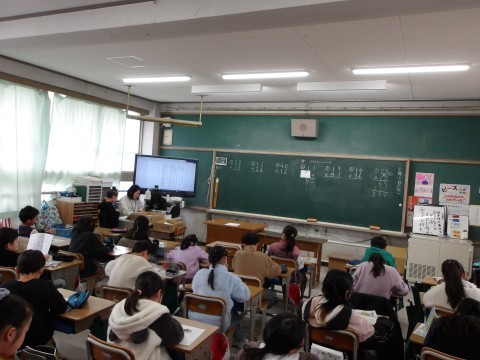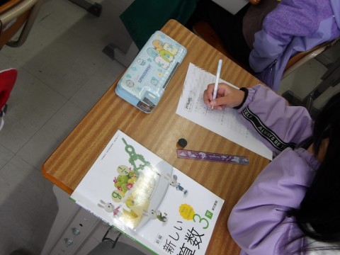 算数では,2ケタのかけ算のひっ算について,プリントを使って学習をしています。数多くの問題を解くことで,解き方はマスターできますよ。