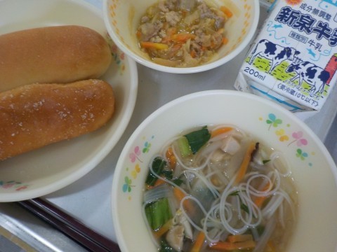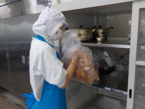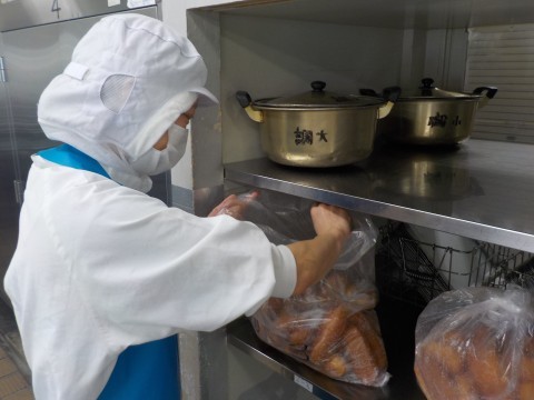 揚げパンは人気の献立なので,楽しみにしている児童も多いです。「揚げパン」は,ミニパンの1つを油で揚げて,グラニュー糖をまぶして作ります。