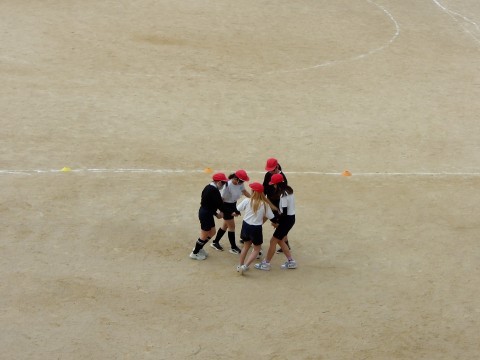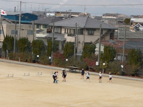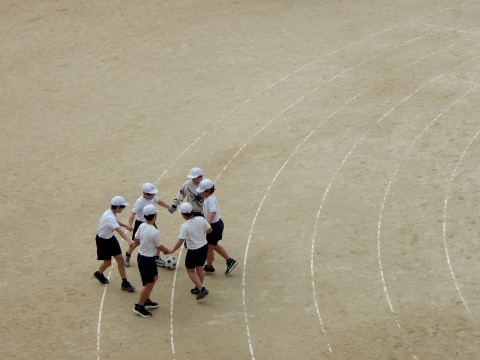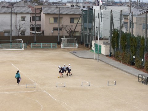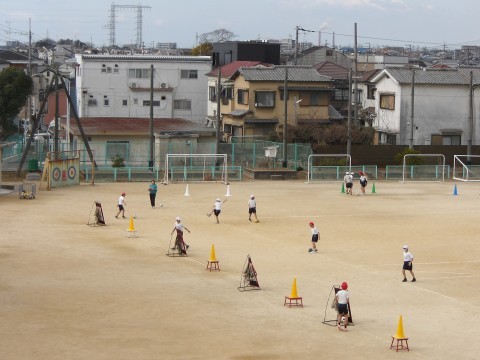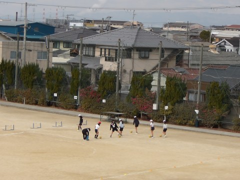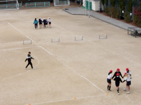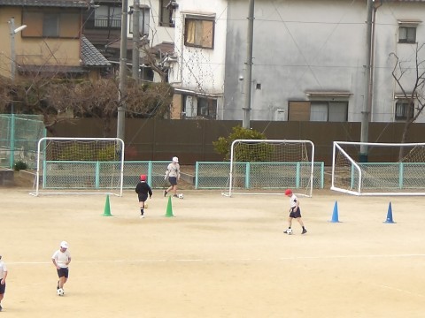 体育の学習「サッカー」では,様々な場の設定で,基礎の技能練習をしています。