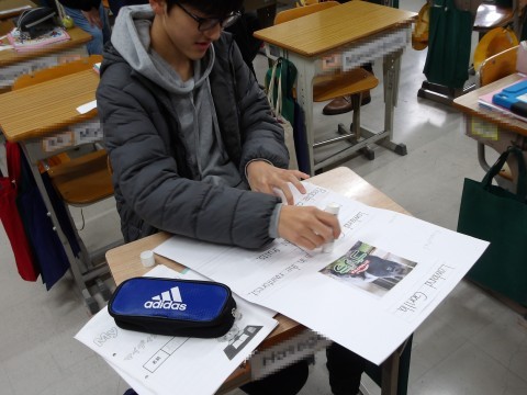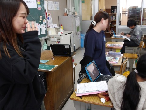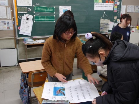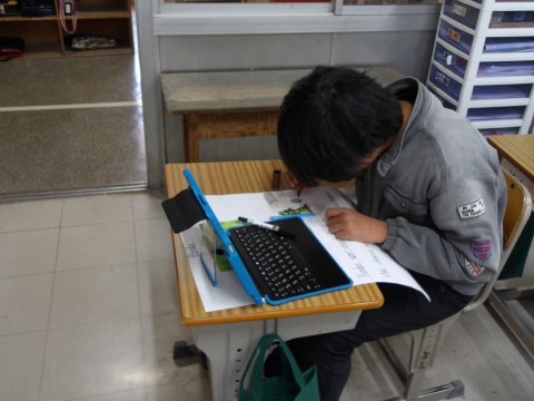 英語では,動物を守る仲間を増やすために,絶滅危惧種について伝えるポスターや動画をつくります。こちらの班は,動画をとっています。