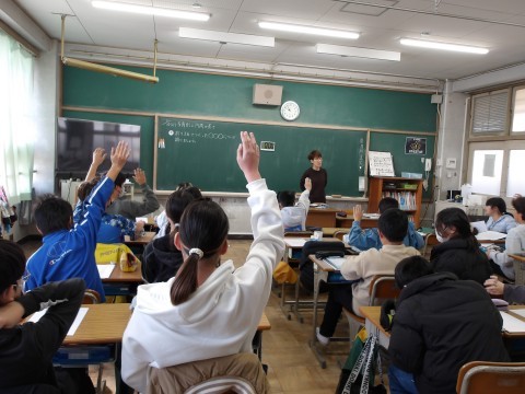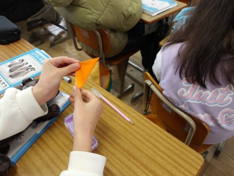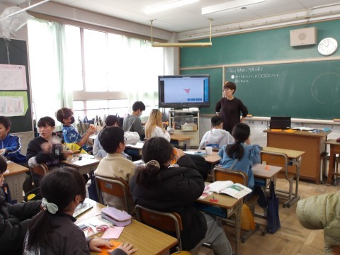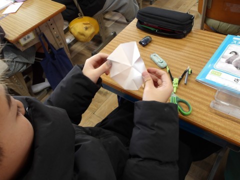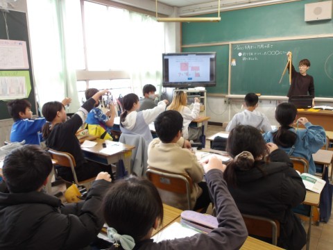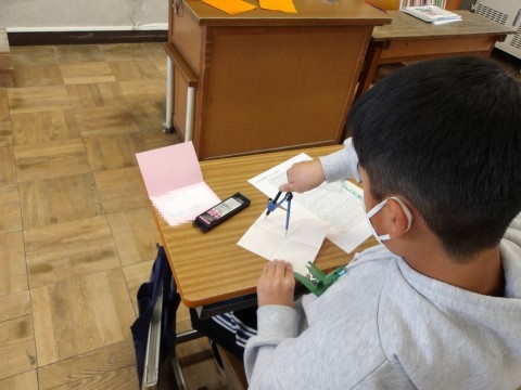 算数「多角形と円周の長さ」では,折り紙を使って円を描き八角形をつくって考えます。先生が,もう一度コンパスの使い方を説明し,正確に円を描くように指導もしています。