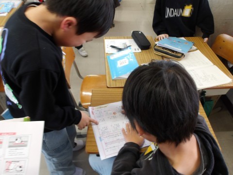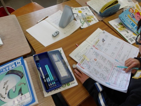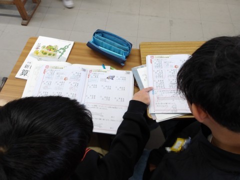 算数では,2ケタ×2ケタの計算問題に取り組んでいます。繰り上がりで計算ミスをしないように,ていねいに計算します。