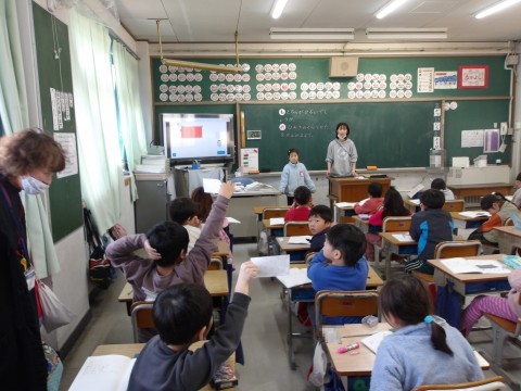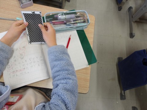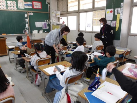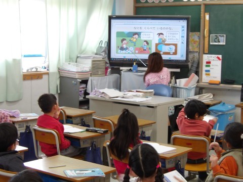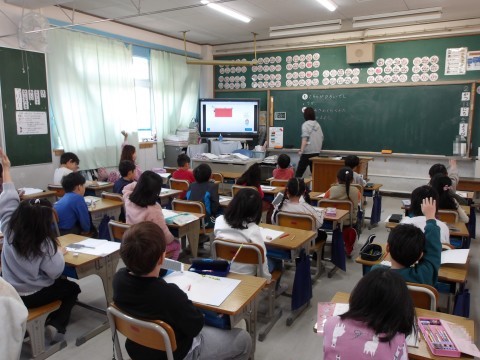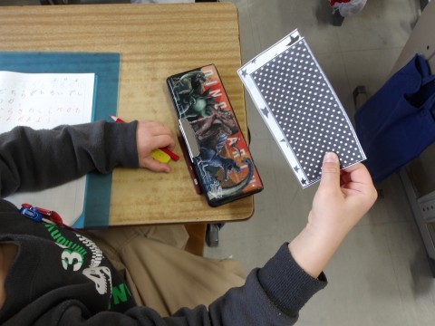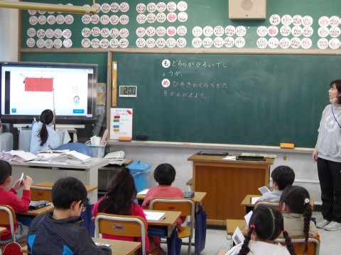 算数では,「シートはどちらが広いか」について考えます。実際に2枚のカードを使って,比べ方を考えます。どちらが広いか,カードを操作しながら重ねてみたり,端の長さを比べたりして答えを見つけます。自分の考えをしっかりと発表しています。